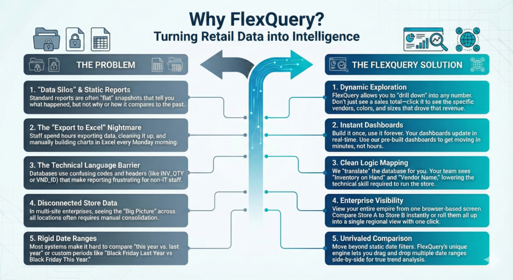 Why FlexQuery? Most retailers are “data rich” but “insight poor.” You collect millions of data points, but getting an answer to a simple question shouldn’t require a degree in computer science.